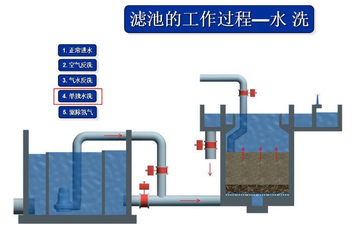 2. 反衝(chōng)洗過程:在反衝洗時,關閉進(jìn)水閥,部分進水通過常開的方孔流入濾池,形成表麵掃(sǎo)洗。反衝洗分為氣衝、氣水聯衝和水衝三個階段,確保濾料(liào)表麵的雜質被(bèi)有效清除。