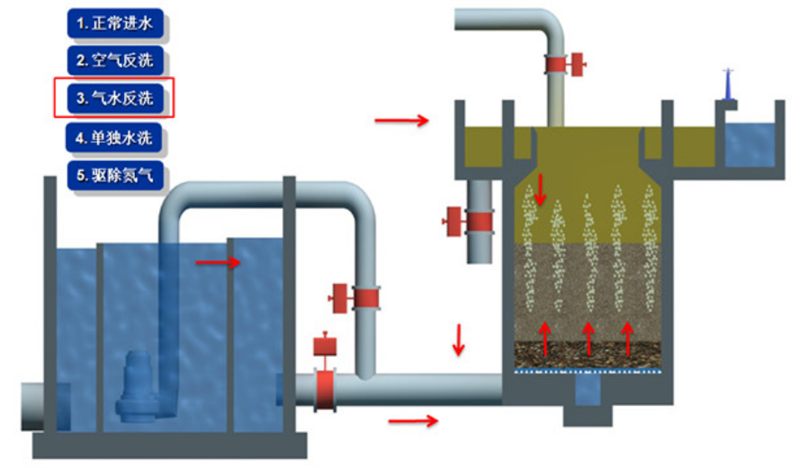 在持續氣衝的同時,開啟反衝洗水閥,通過底部布水係統通入反衝洗水。氣、水共同作用下,進一步強化濾料的擾動和摩擦效果,將剝離的汙(wū)染物衝刷懸浮於水中,此階段通常持(chí)續 4-6 分鍾。
