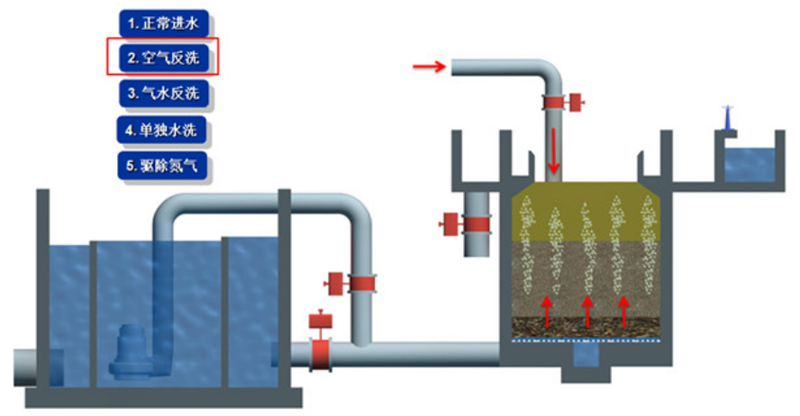 開啟反衝洗空(kōng)氣閥,通過底部布氣係統向濾料層通入(rù)空氣,利用空氣的攪拌作用,使濾料顆粒相互摩擦、碰撞,鬆動濾料層,將附著在濾料表麵的汙(wū)泥、老化(huà)生物膜初步(bù)剝離,此階段一般持續 3-5 分鍾。