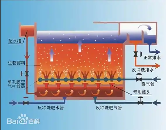 特點:占地麵積小,處理效率高,生物膜活性高(gāo),抗衝擊負荷(hé)能力強;集生物氧化和過濾於一體,簡化了處理流程;濾料可截留汙水中的懸浮物,減少後續處理單元的負荷(hé);但需要定期反衝洗,以去除濾層內的生物膜(mó)和(hé)截留的(de)雜質。